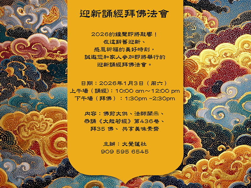 2026的鐘聲即將敲響!在這辭舊迎新、感恩祈福的美好時刻,誠邀您和家人參加1月3日舉行的元旦迎新誦經拜佛法會。讓我們齊聚一堂,廣作供養,聆聽法師開示,虔誦《大般若經》,禮拜35佛,累積殊勝資糧,供養三寶。祈願在新的一年,闔家安康,世界和平,吉祥如意。