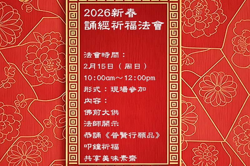 誠摯邀請您參加 2026年 新春誦經祈福法會,法會將於2月15日上午隆重舉行。在這充滿喜慶與希望的農曆新年,我們以虔誠的心為家人祈求幸福安康,共沐佛光。讓我們齊聚一堂,至心禮佛、供養、誦經,祈願佛光普照,福慧雙增,眾生安康,世界和平。...